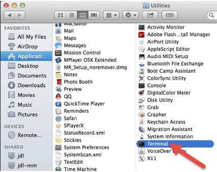 Open Finder, and navigate to Applications - Utilities - Terminal (double-click to launch).